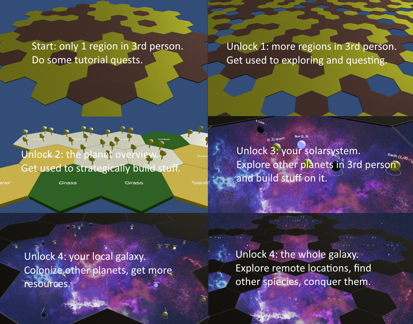 The hexagon and gameplay levels system ties in into the progress. The idea is to unfold it like this: